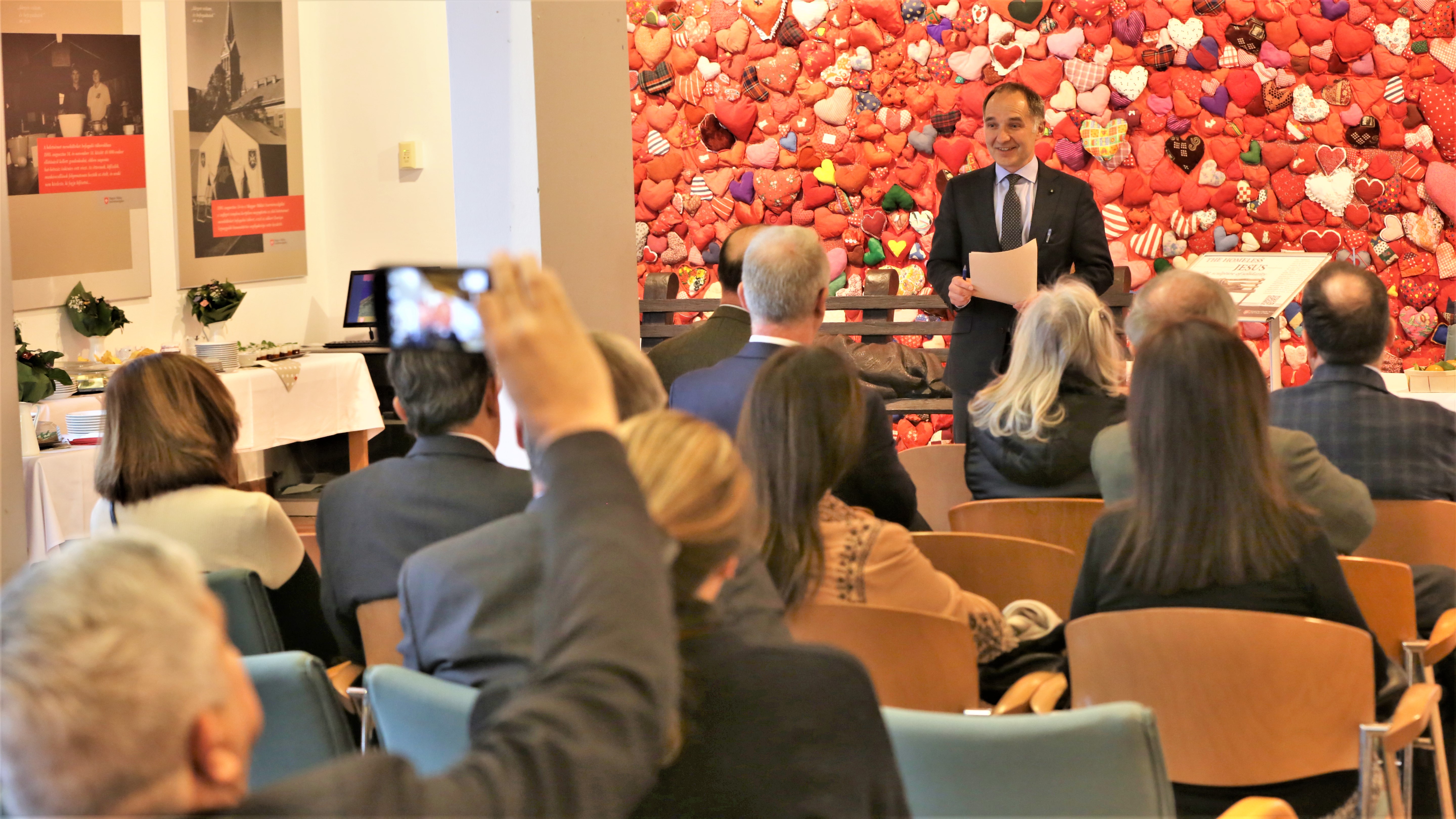 On the day before the meeting, the participants visited the House of Acceptance, where Miklós Vecsei, vice-president of the Hungarian Charity Service of the Order, gave them an overview of the history and activities of the Charity Service. The meeting itself took place in the main conference hall of the parish centre of Our Lady of Buda Castle, preceded by an English-language Mass in the crypt of Matthias Church. On Sunday, the guests and members of the Hungarian Association, wearing church robes, attended the 10 o'clock solemn musical Mass in Matthias Church, at which the orchestra and choir of the church performed Mozart's Coronation Mass.